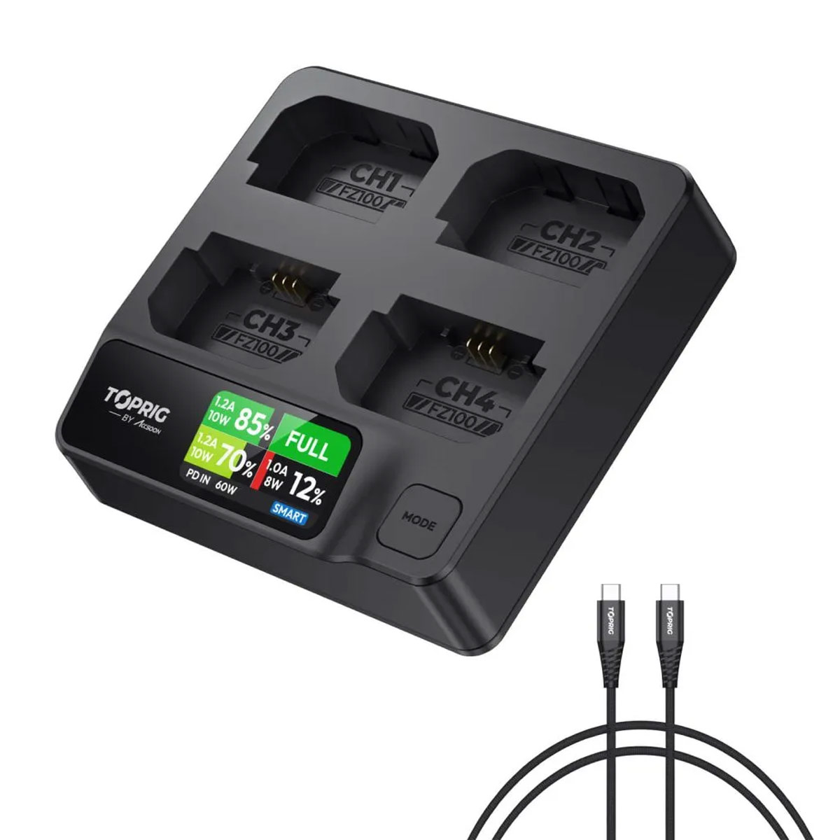 Accsoon TopRig brzi punjač 100 W sa 4 ležišta za NP‑FZ100 baterije (BC02) je profesionalni punjač visokih performansi dizajniran za efikasno i simultano punjenje četiri NP‑FZ100 baterije koje se najčešće koriste u foto i video kamerama, monitorima, LED svetlima i drugoj produkcijskoj opremi. Sa ukupnom snagom od 100 W, omogućava brzo, pouzdano i stabilno punjenje više baterija istovremeno, što ga čini idealnim rešenjem za filmske setove, studijske produkcije i terenska snimanja gde je potrebna velika količina napajanja baterijama.