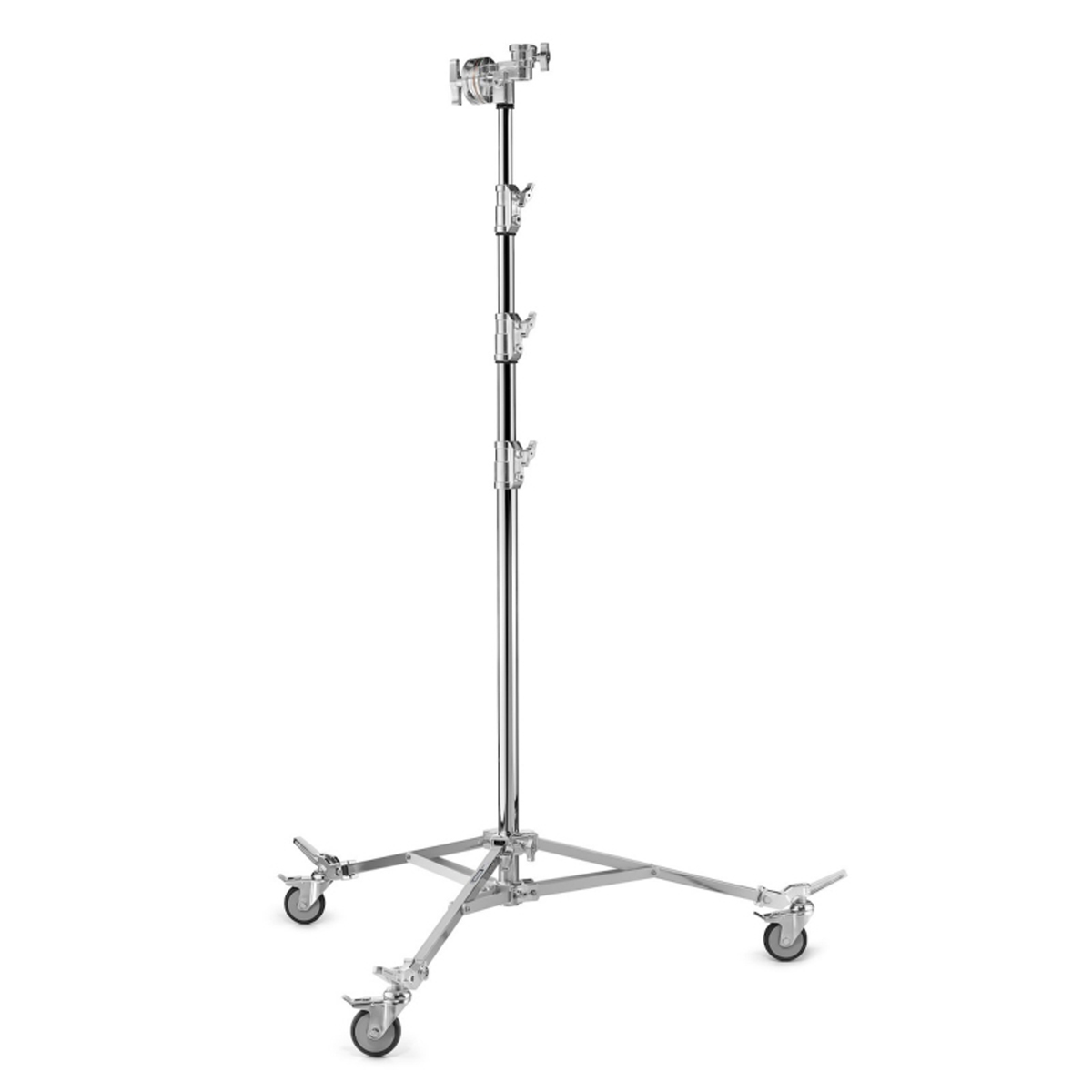 Avenger A3043CS Overhead Stand 43 CS je profesionalni overhead studio stativ izrađen od kromirane čelične konstrukcije sa ugrađenom grip glavom i točkićima sa kočnicama, dizajniran da podržava prečke, cevi i overhead ramove u foto i video studijima. Ima 4 sekcije i 3 podizača i omogućava podešavanje visine od oko 150 cm do maksimalnih 430 cm, uz nosivost do 40 kg. Ovaj model je robustan i stabilan, idealan za podizanje rasvete, pozadinskih sistema ili drugih teških elemenata iznad scene.