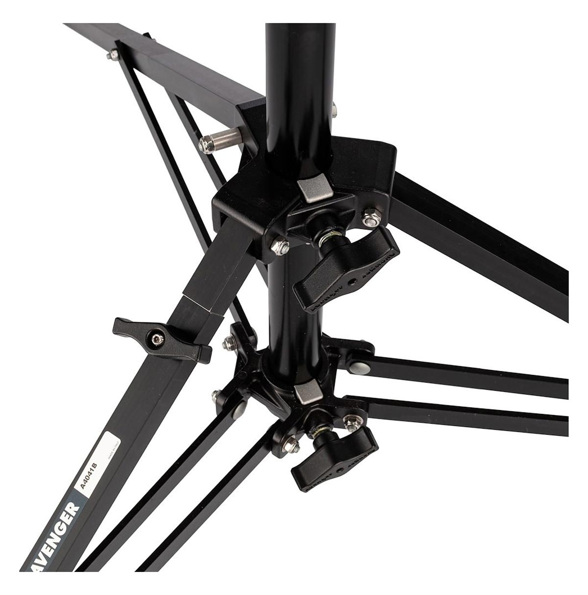Avenger A4041B Boom Stand Aluminium je laki, ali robusni kombinovani stativ/boom stalak izrađen od anodizovanog aluminijuma sa 4 sekcije i 3 podizača, koji se može koristiti kao tradicionalni stativ za svetlo ili preklopiti u boom (ramenu) konfiguraciju zahvaljujući pivot klampi u drugom podizaču. Ima jednu nivelišuću nogu za postavljanje na neravnom terenu, nosivost do 10 kg i maksimalnu visinu do oko 410 cm, dok boom produžetak može dostići do 210 cm uz odgovarajuću nosivost. U paketu dolazi prazna protivtežna vreća (sandbag) za veću stabilnost pri radu u boom režimu.