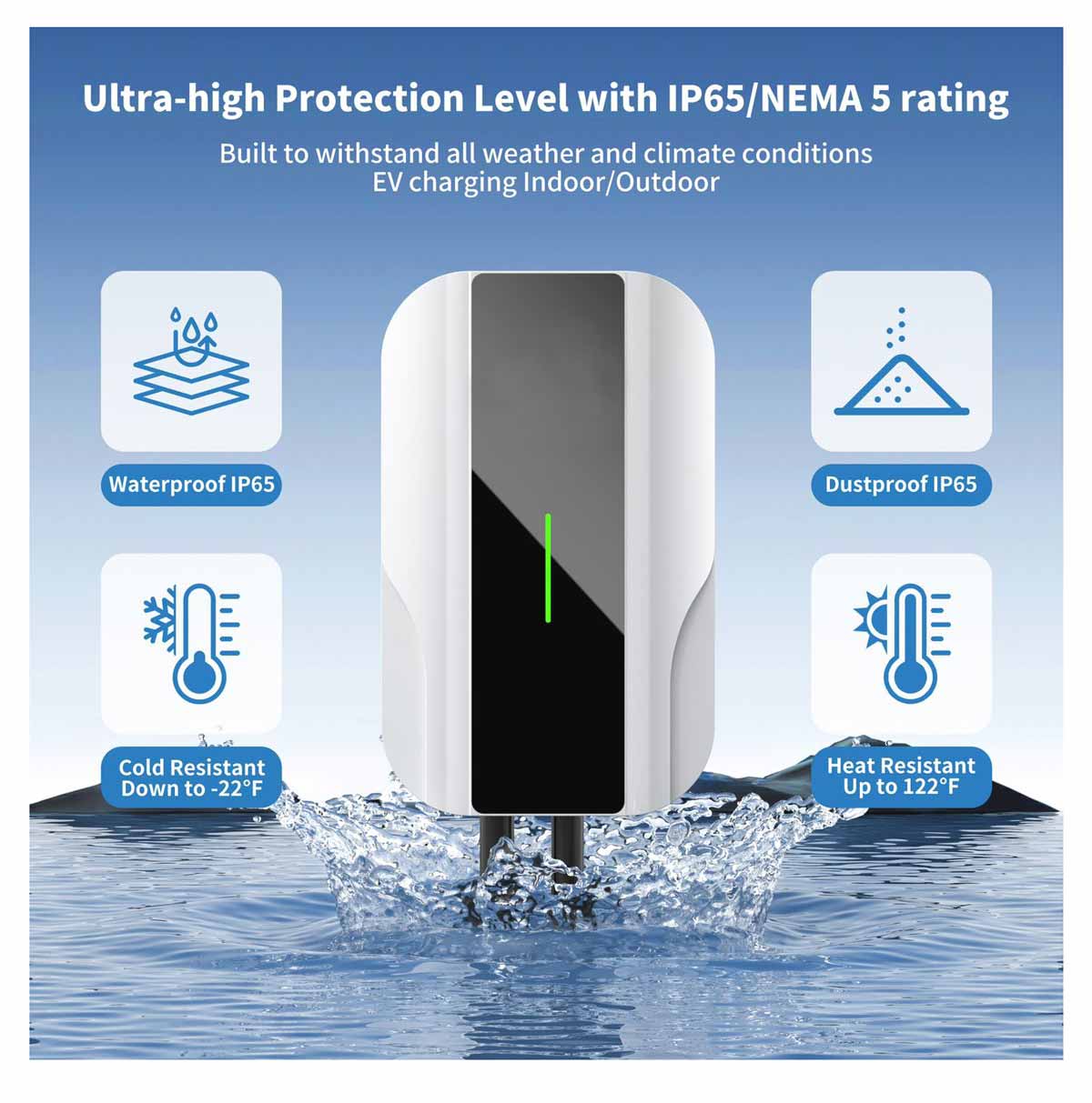 Otpornost i zaštita: IP65 zaštita od prašine i prskanja vode, uz integrisane sigurnosne mehanizme koji osiguravaju bezbedno punjenje u svim uslovima.