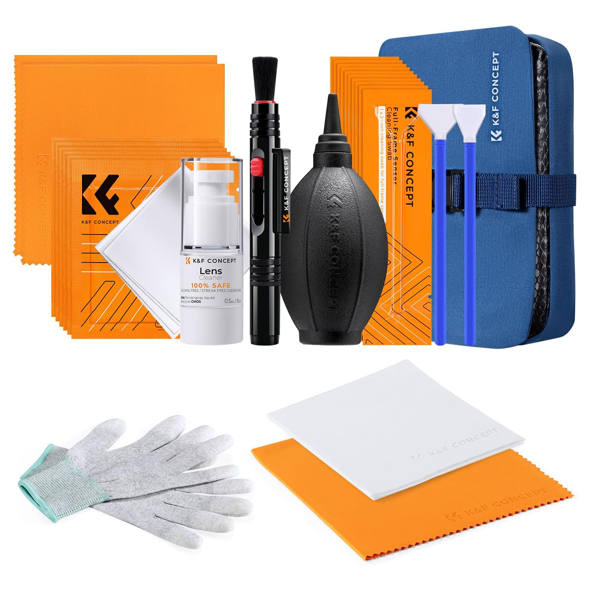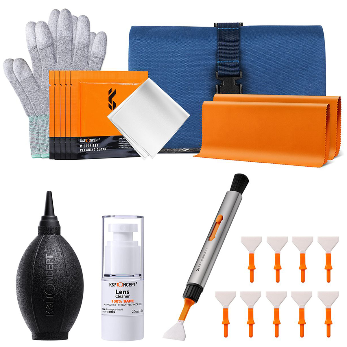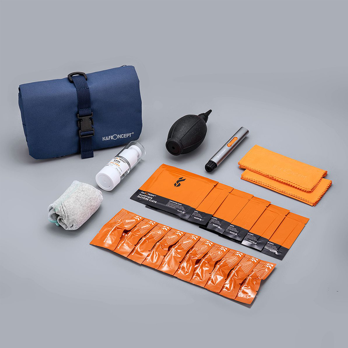 Set za čišćenje DSLR fotoaparata uključuje: olovku za čišćenje objektiva, pumpicu za vazduh, tečnost za čišćenje, štapiće za čišćenje senzora od 24 mm Full Frame (10 komada), veliku krpu za čišćenje (2 komada), malu vakuumsku krpu za čišćenje (6 komada), antistatičke rukavice (1 par) i torbicu za odlaganje.