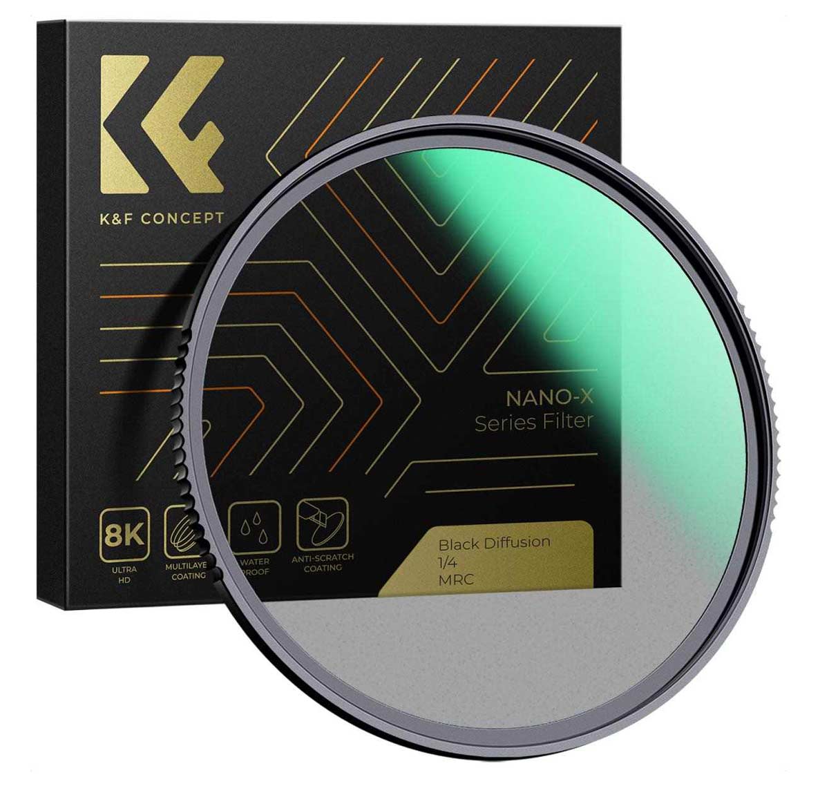 K&F Concept 67mm 1/4 Black Mist Diffusion filter pruža mekše tonove i suptilno smanjuje kontrast, idealan za kreativnu fotografiju i video.