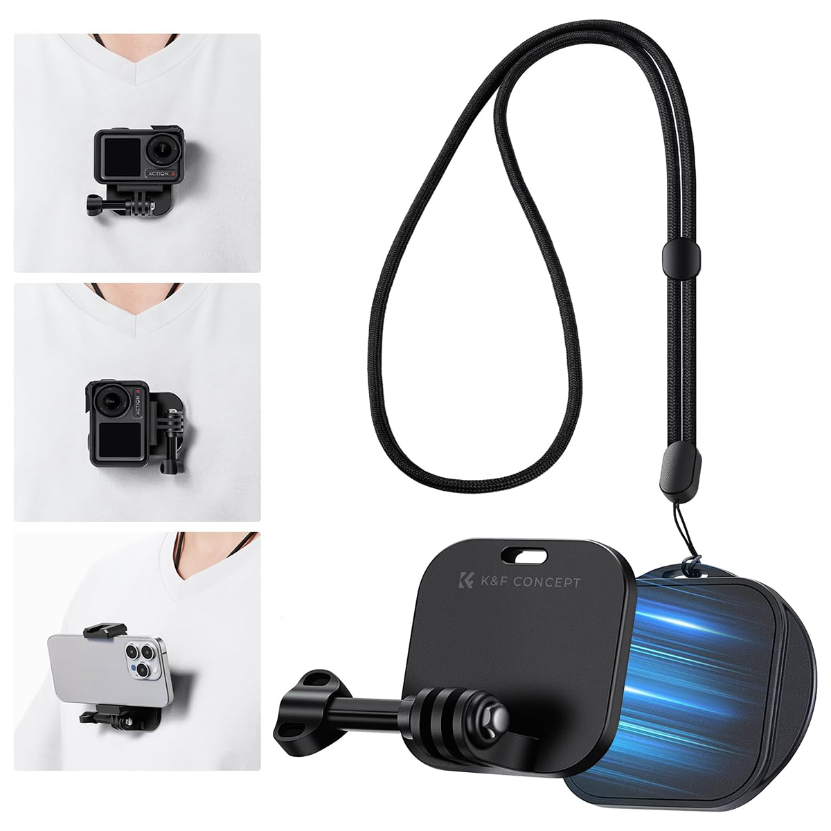 K&F Concept magnetni grudni/vratni nosač za GoPro KF31.116 je magnetni grudni/vratni nosač za akcione kamere – kompaktan, neprimetan ispod odeće, sa snažnim N52 magnetima za sigurno pričvršćivanje. Može se koristiti na metalnim i nemetalnim površinama. Kompatibilan sa GoPro, DJI Osmo, Insta360 i drugim kamerama, kao i sa telefonima širine 65–95 mm.