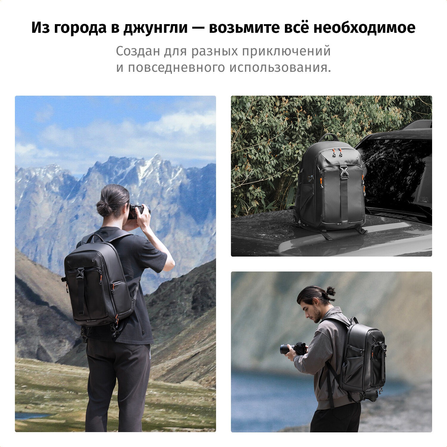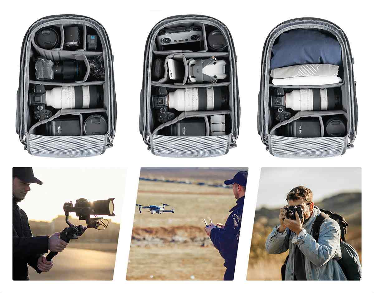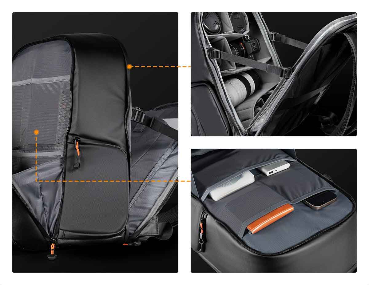 Ranac ima podesive pregrade koje omogućavaju optimalnu organizaciju, brzi bočni pristup za trenutni dohvat opreme, ergonomsku konstrukciju sa podešivim naramenicama i sternum trakom, kao i vodootpornu izradu sa dodatnim kišnim pokrivačem. Dodatne pregrade za SD kartice, kablove i telefon, kao i držač za stativ, čine ga idealnim saveznikom na terenu ili u putovanjima.