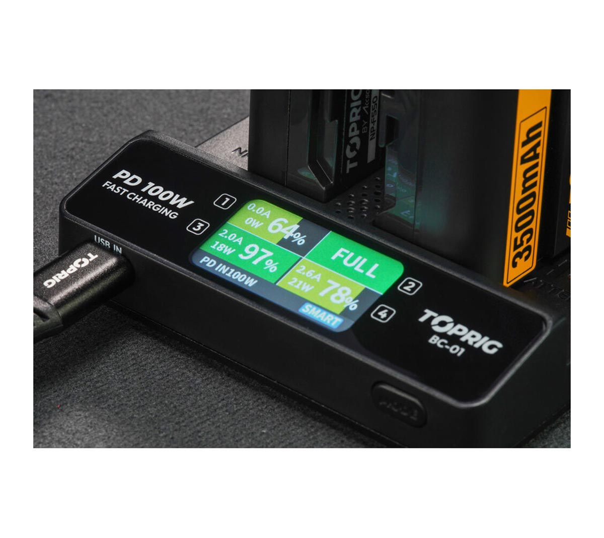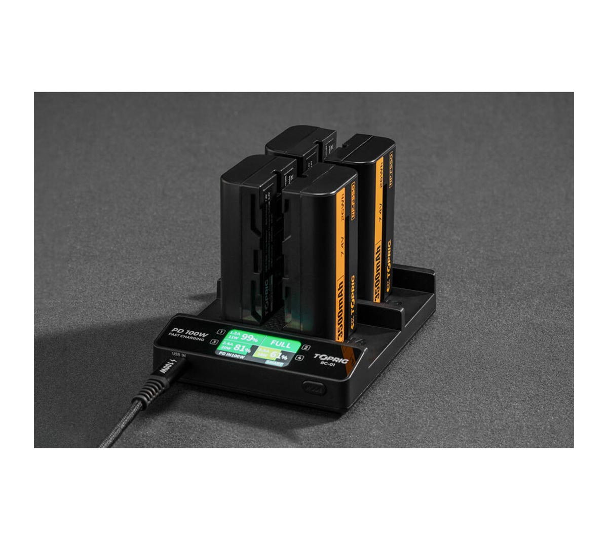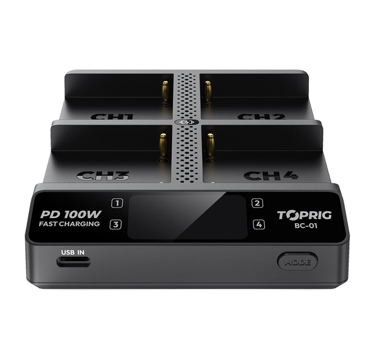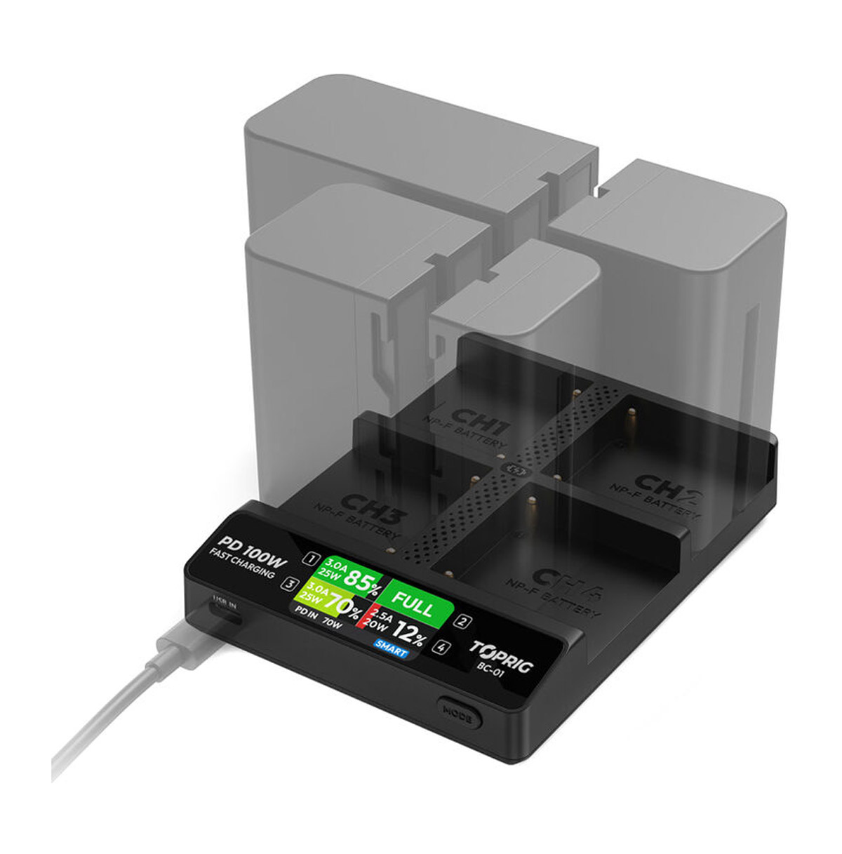 Accsoon TopRig brzi punjač 100 W sa 4 ležišta za NP‑F baterije (BC01) je profesionalni punjač visokih performansi dizajniran za simultano punjenje četiri NP‑F serija baterije koje se najčešće koriste u foto/video opremi, monitorima, bežičnim prenosnicima, svetlima i drugim uređajima. Sa ukupnom snagom od 100 W, omogućava brzo, efikasno i sigurno punjenje više baterija istovremeno. Idealno za produkcije sa velikim obimom opreme.