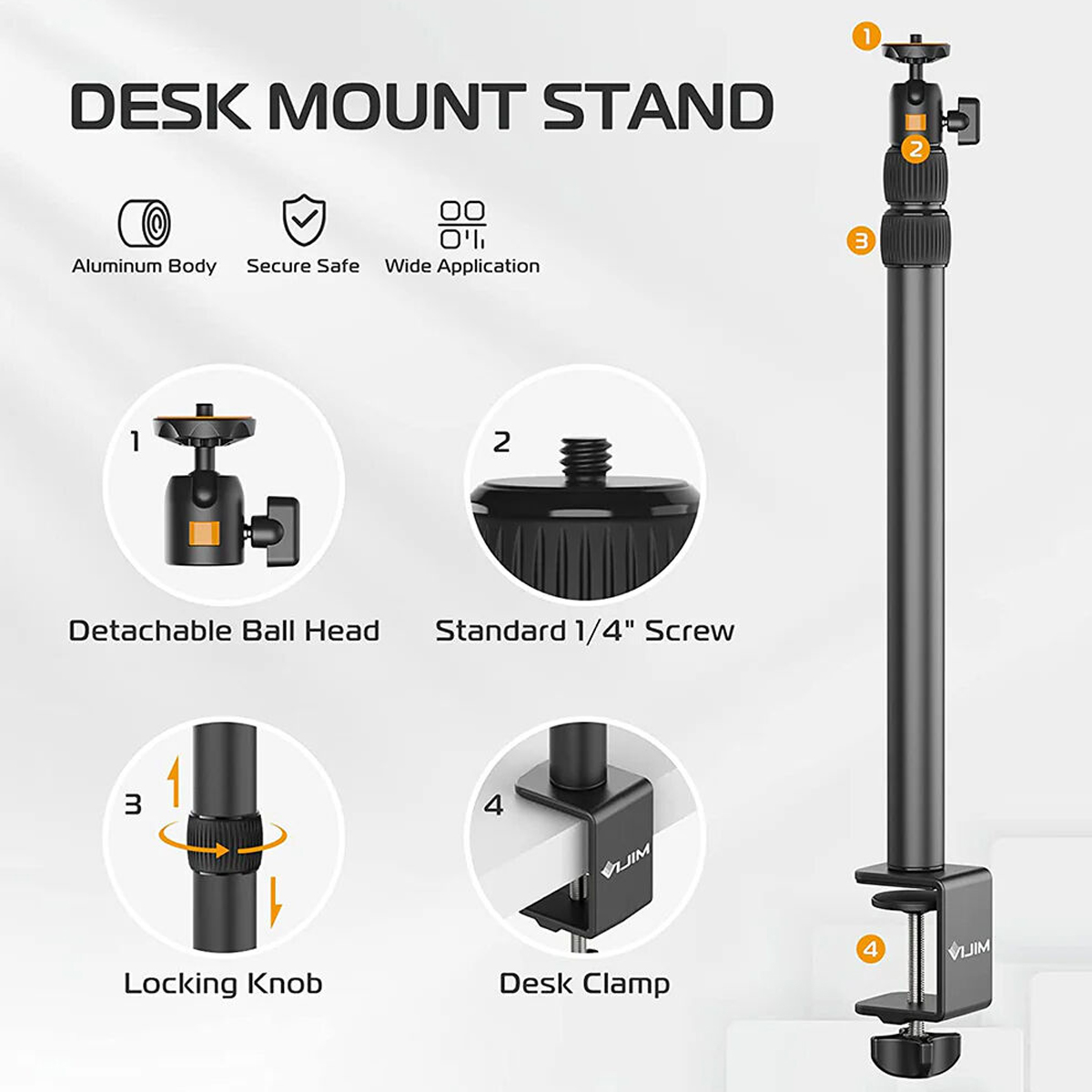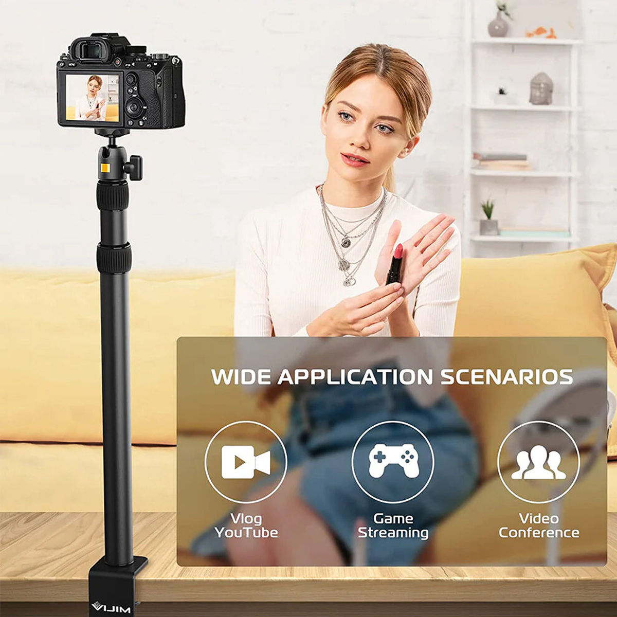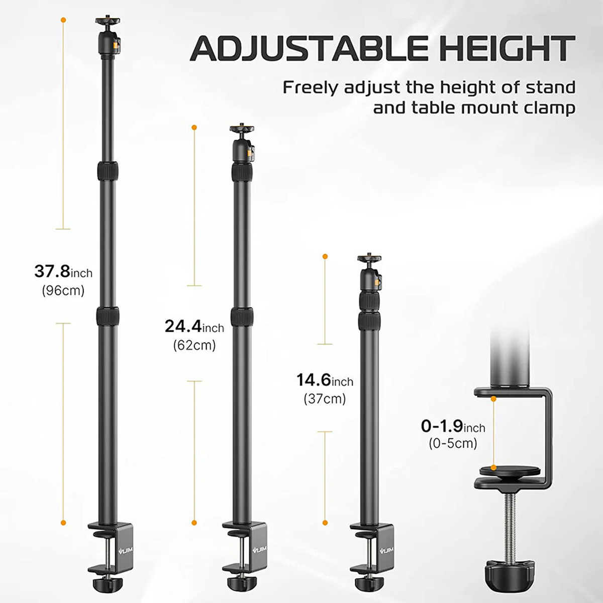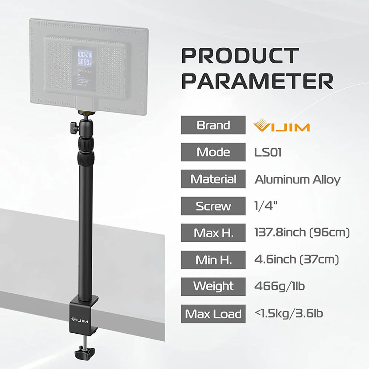 Postavite svetlo ili veb-kameru na svoju radnu stanicu pomoću VIJIM LS01 podesivog stonog stalka za osvetljenje marke Ulanzi. Podesite dužinu stalka od 37 do 96 cm. Fiksirajte stalak na željenu visinu pomoću zateznih točkića. 360° kuglasta glava omogućava pozicioniranje montirane kamere ili svetla; kuglasta glava se može skinuti kako biste dodatak montirali direktno na stalak. Lagana aluminijumska konstrukcija čini stalak lakim za nošenje.